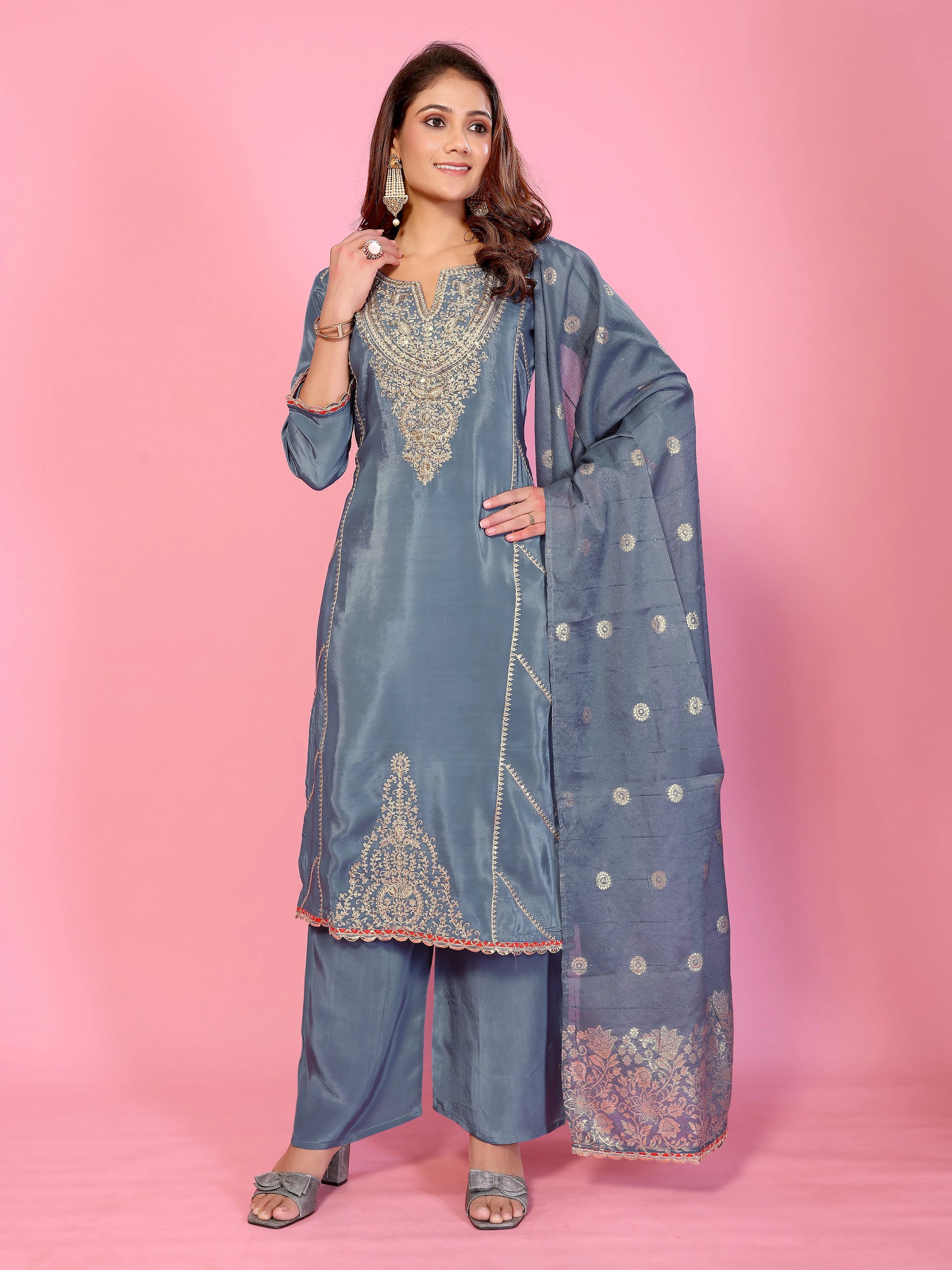 Elegant Steel Blue Embroidered Kurta Set with Dupatta
