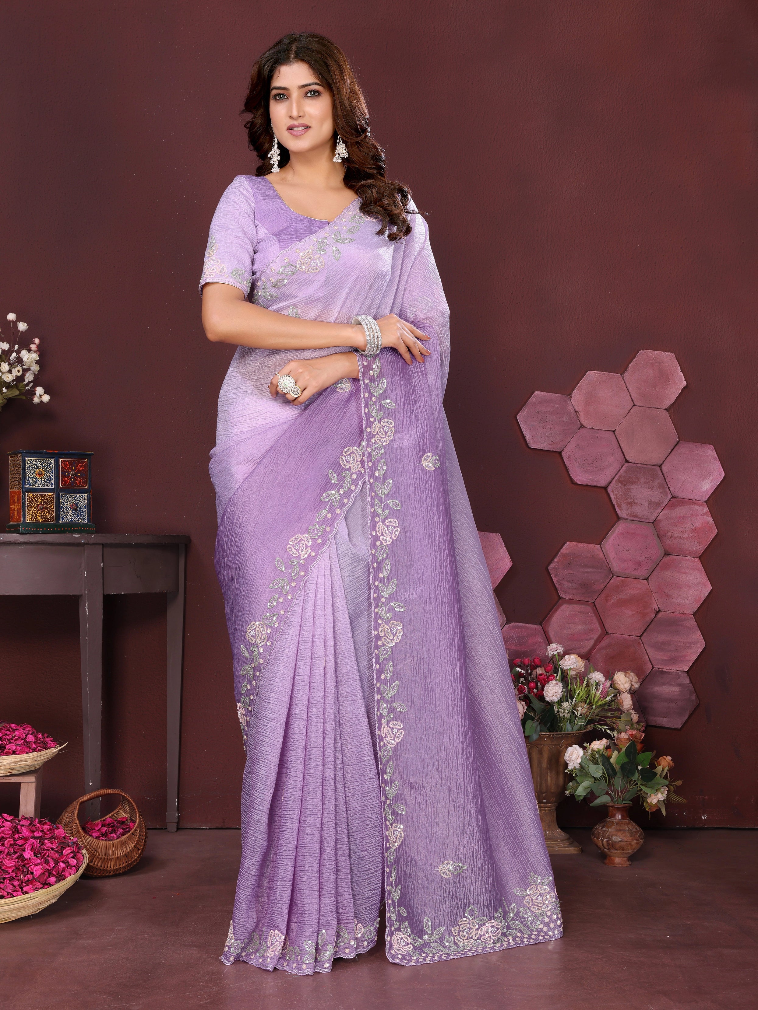 Lilac Blossom Crushed Tissue Saree With Cutdana And Sequin Border